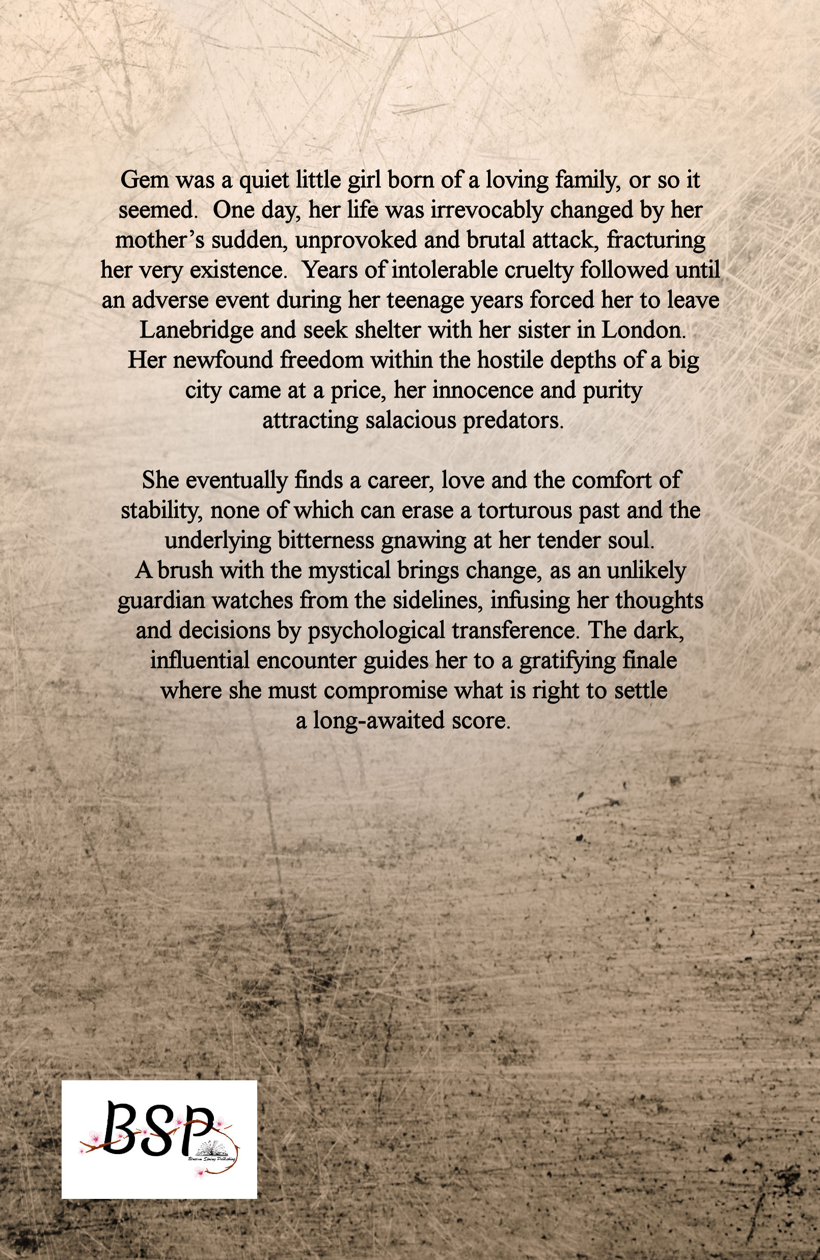Gem was a quiet little girl born of a loving family, or so it seemed. One day, her life was irrevocably changed by her mother’s sudden, unprovoked and brutal attack, fracturing her very existence. Years of intolerable cruelty followed until an adverse event during her teenage years forced her to leave Lanebridge and seek shelter with her sister in London. Her newfound freedom within the hostile depths of a big city came at a price, her innocence and purity attracting salacious predators.