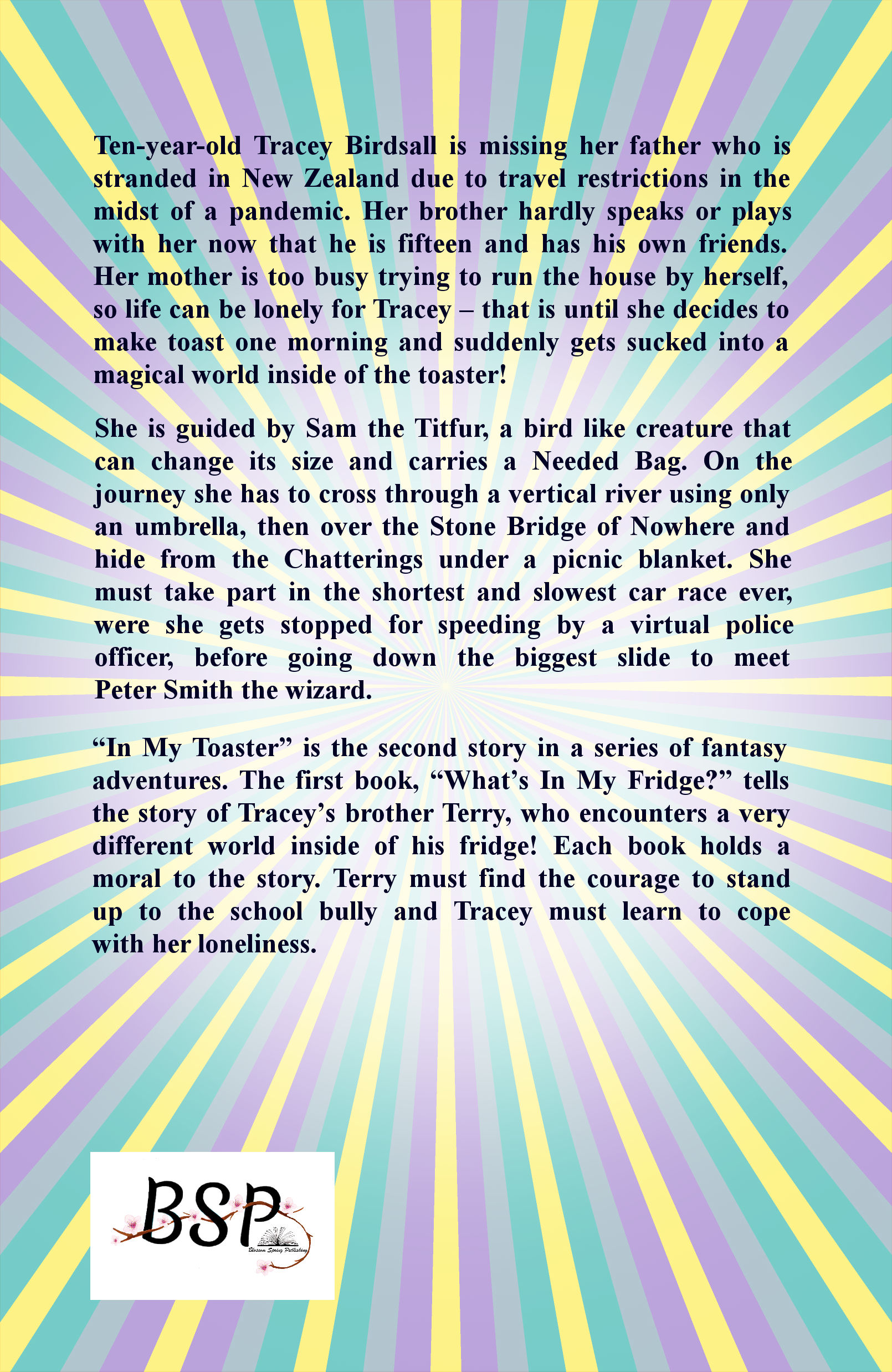 “In My Toaster” is the second story in a series of fantasy adventures. The first book, “What’s In My Fridge?” tells the story of Tracey’s brother Terry, who encounters a very different world inside of his fridge! Each book holds a moral to the story. Terry must find the courage to stand up to the school bully and Tracey must learn to cope with her loneliness.