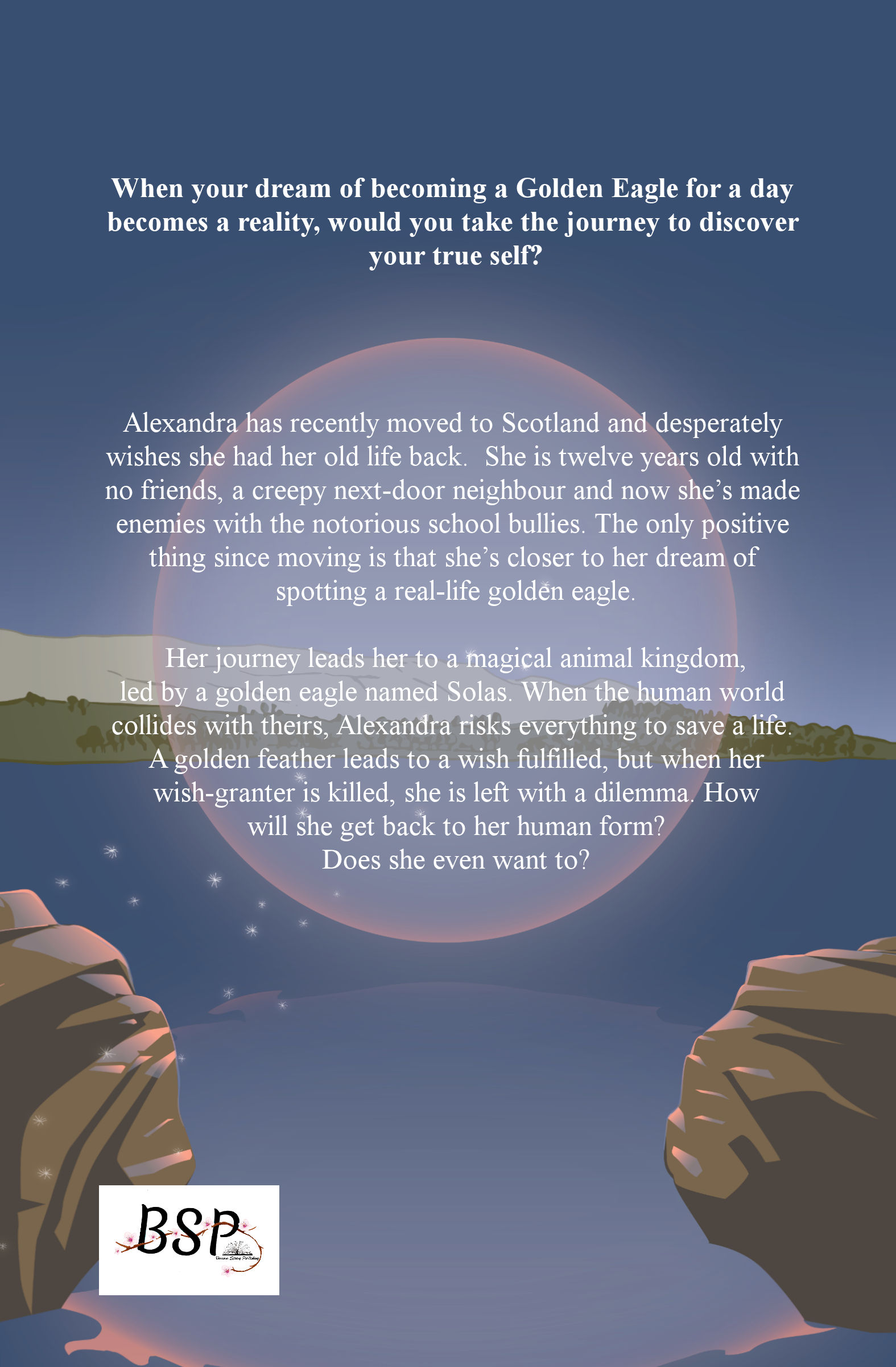 Her journey leads her to a magical animal kingdom, led by a golden eagle named Solas. When the human world collides with theirs, Alexandra risks everything to save a life. A golden feather leads to a wish fulfilled, but when her wish-granter is killed, she is left with a dilemma. How will she get back to her human form? Does she even want to?